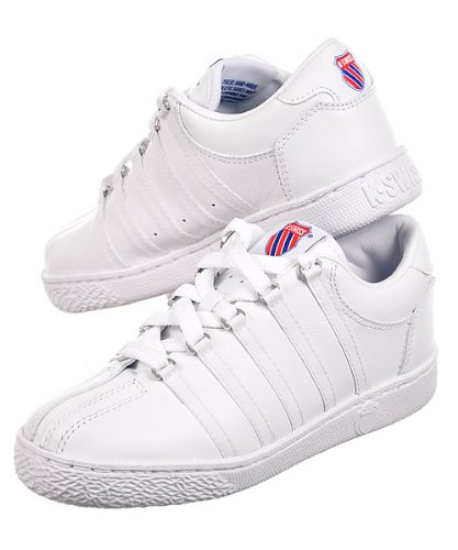This popular K-Swiss Classic features signature five-stripe detailing, a three-piece toe, and a D-Ring lacing system. In all white, this makes a great school shoe!